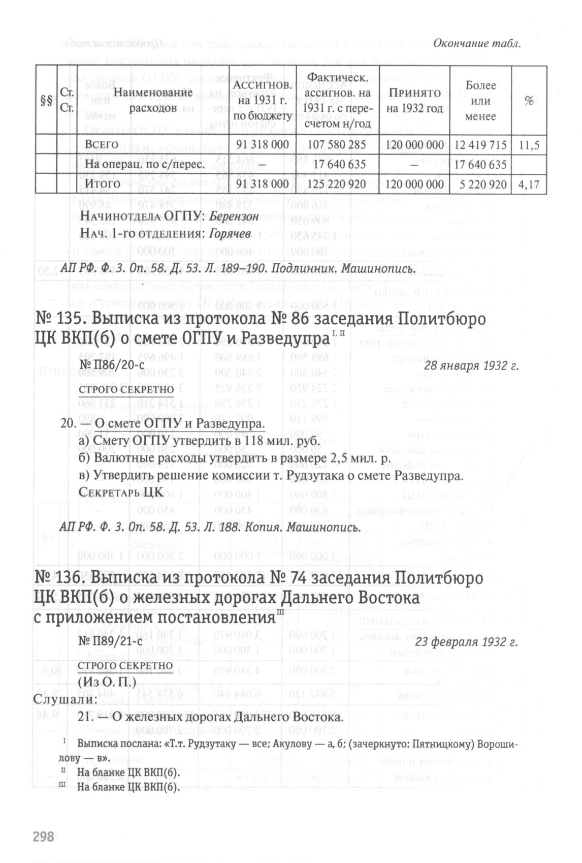 Выписка из протокола № 86 заседания Политбюро ЦК ВКП(б) о смете ОГПУ и Разведупра. 28 января 1932 г. // АП РФ. Ф. 3. Oп. 58. Д. 53. Л. 188. Копия. Машинопись.