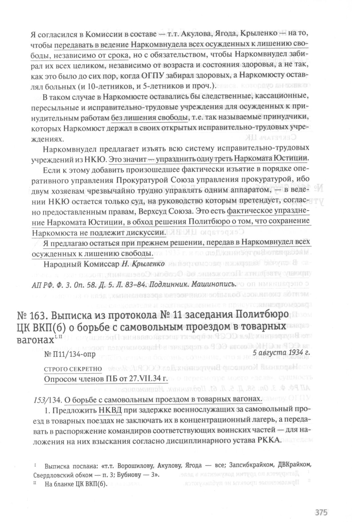 Выписка из протокола № 11 заседания Политбюро ЦК ВКП(б) о борьбе с самовольным проездом в товарных вагонах. 5 августа 1934 г. // АП РФ. Ф. 3. Oп. 58. Д. 5. Л. 40. Копия. Машинопись.