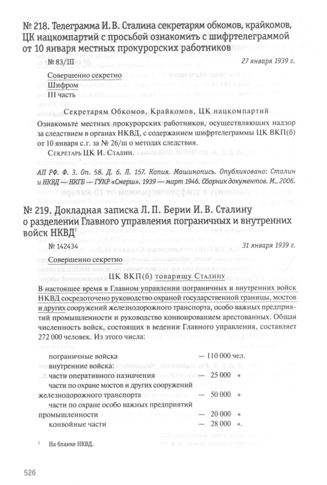 Телеграмма И.В. Сталина секретарям обкомов, крайкомов, ЦК нацкомпартий с просьбой ознакомить с шифртелеграммой от 10 января местных прокурорских работников. 27 января 1939 г. // АП РФ. Ф. 3. Oп. 58. Д. 6. Л. 157. Копия. Машинопись. Опубликовано: Сталин и НКВД - НКГБ - ГУКР «Смерш». 1939 - март 1946. Сборник документов. М., 2006.