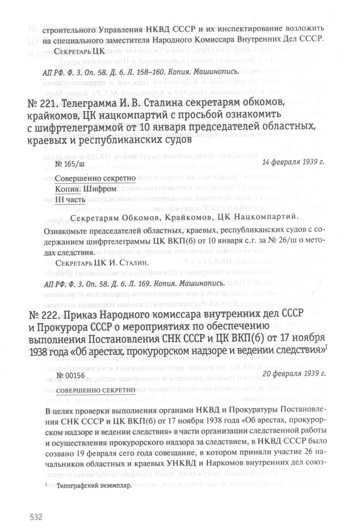 Телеграмма И.В. Сталина секретарям обкомов, крайкомов, ЦК нацкомпартий с просьбой ознакомить с шифртелеграммой от 10 января председателей областных, краевых и республиканских судов. 24 февраля 1939 г. // АП РФ. Ф. 3. Oп. 58. Д. 6. Л. 169. Копия. Машинопись.