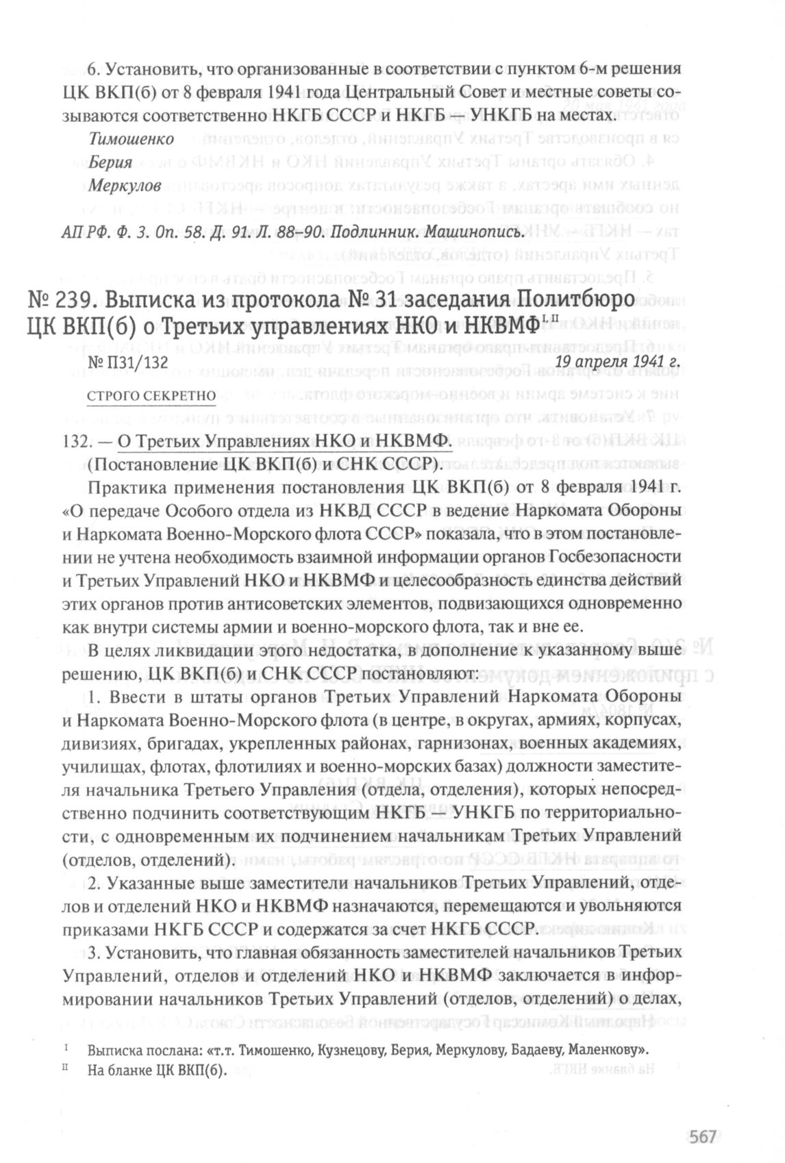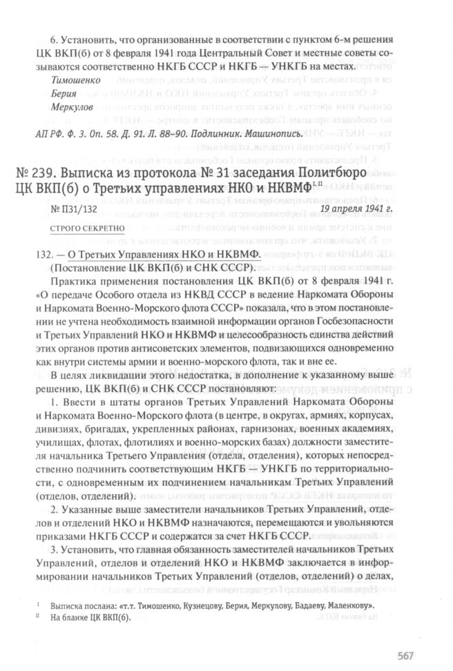 Выписка из протокола № 31 заседания Политбюро ЦК ВКП(б) о Третьих управлениях НКО и НКВМФ. 19 апреля 1941 г. // АП РФ. Ф. 3. Oп. 58. Д. 91. Л. 86-87. Копия. Машинопись.
