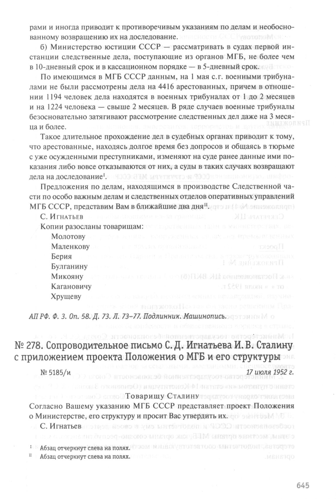 АП РФ. Ф. 3. Oп. 58. Д. 10. Л. 144. Подлинник. Машинопись; Л. 145-158. Копия. Машинопись.