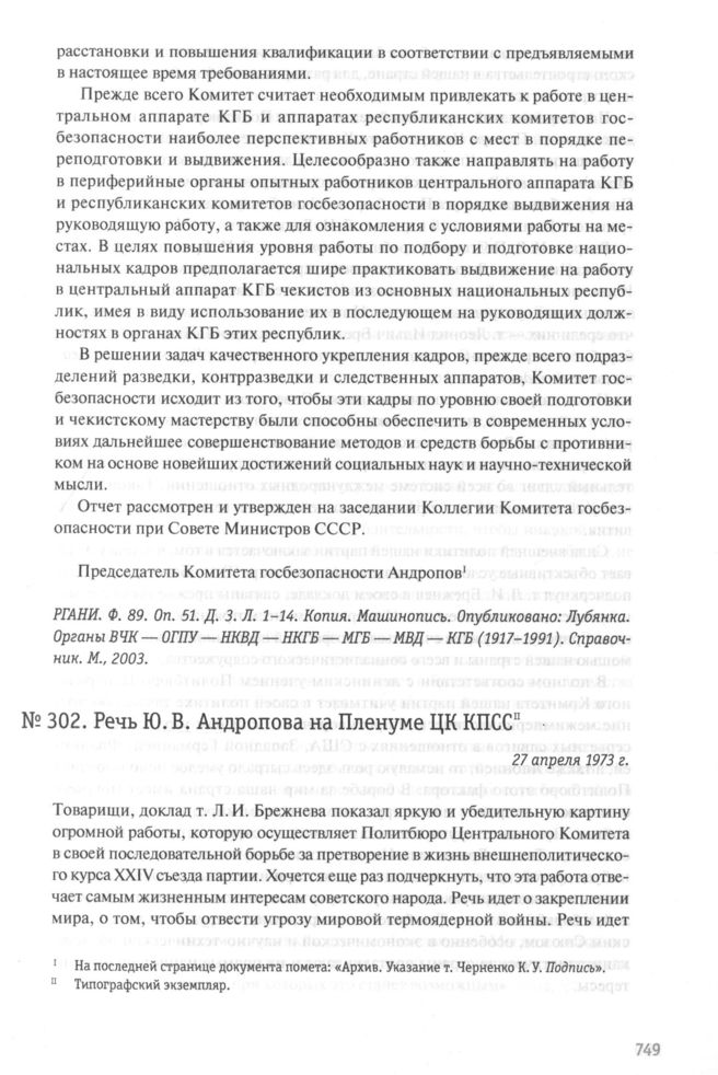 Речь Ю.В. Андропова на Пленуме ЦК КПСС. 27 апреля 1973 г. // АП РФ. Ф. 2. Oп. 4. Д. 21. Л. 114-115 об. Копия. Машинопись. Опубликовано: Лубянка. Органы ВЧК - ОГПУ- НКВД - НКГБ - МГБ - МВД - КГБ (1917-1991). Справочник. М., 2003.
