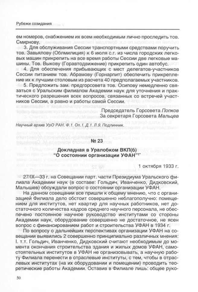 Докладная в Уралобком ВКП(б) “О состоянии организации УФАН”. 1 октября 1933 г. // Научный архив УрО РАН. Ф. 1. Оп. 1. Д. 2. ЛЛ. 28—28 об. Копия.