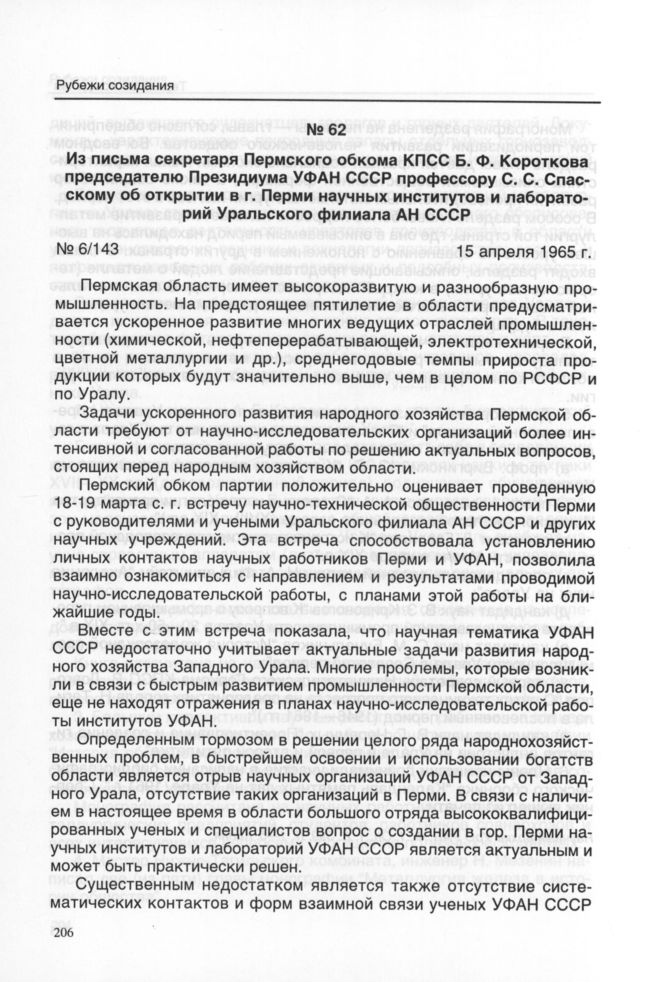 Из письма секретаря Пермского обкома КПСС Б.Ф. Короткова председателю Президиума УФАН СССР профессору С.С. Спасскому об открытии в г. Перми научных институтов и лабораторий Уральского филиала АН СССР. 15 апреля 1965 г.