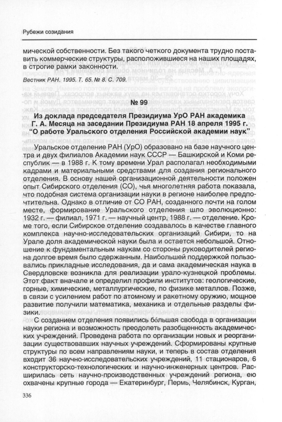 Из доклада председателя Президиума УрО РАН академика Г.А. Месяца на заседании Президиума РАН 18 апреля 1995 г. “О работе Уральского отделения Российской академии наук” // Вестник РАН. 1995. Т. 65. № 10. С. 873—880.