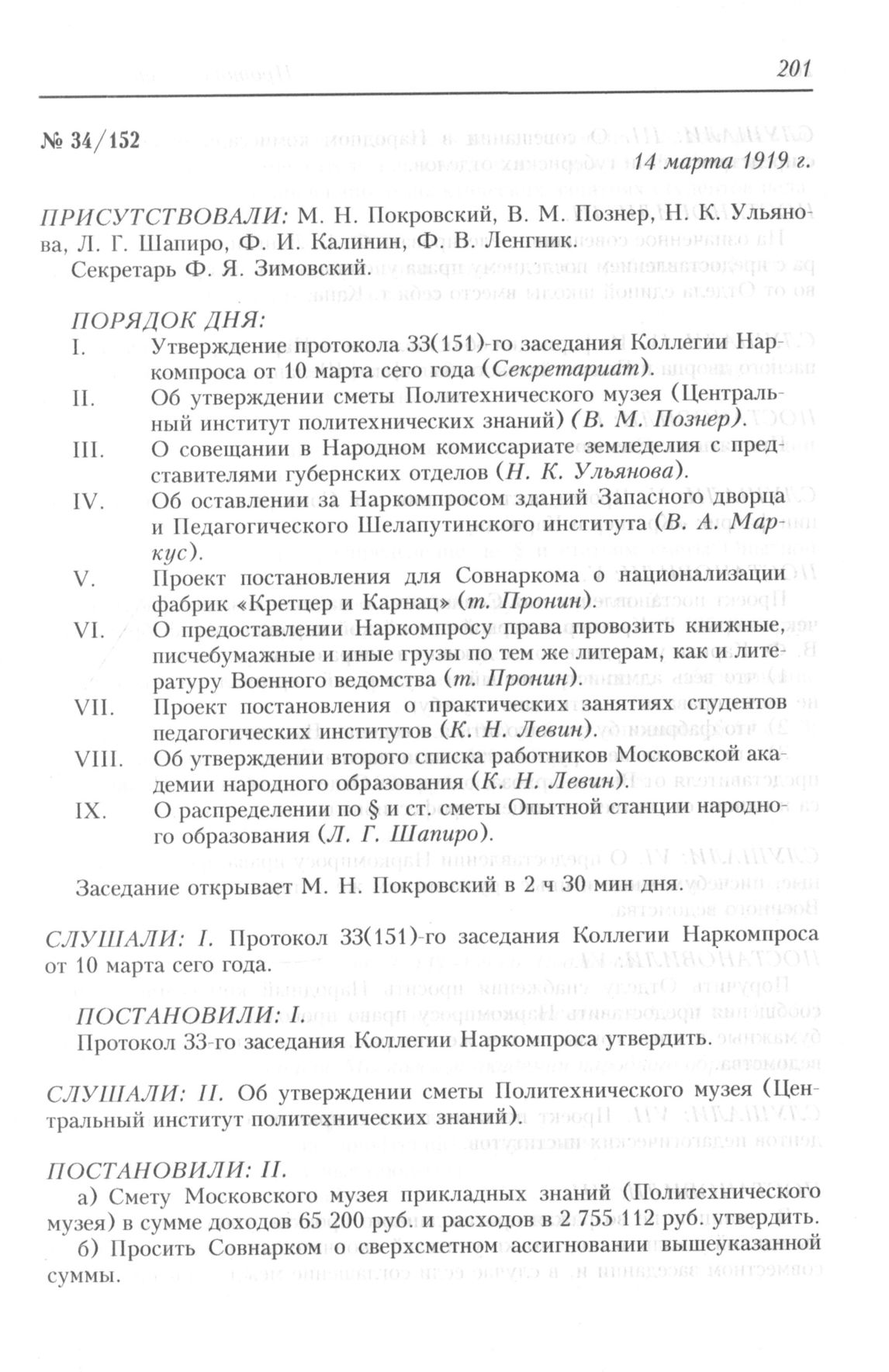 Протокол заседания Коллегии Народного комиссариата по просвещению РСФСР № 34/152. 14 марта 1919 г. // ГА РФ. Ф. А-2306. Оп. 1. Д. 180. Л. 149-150 об. Подлинник.