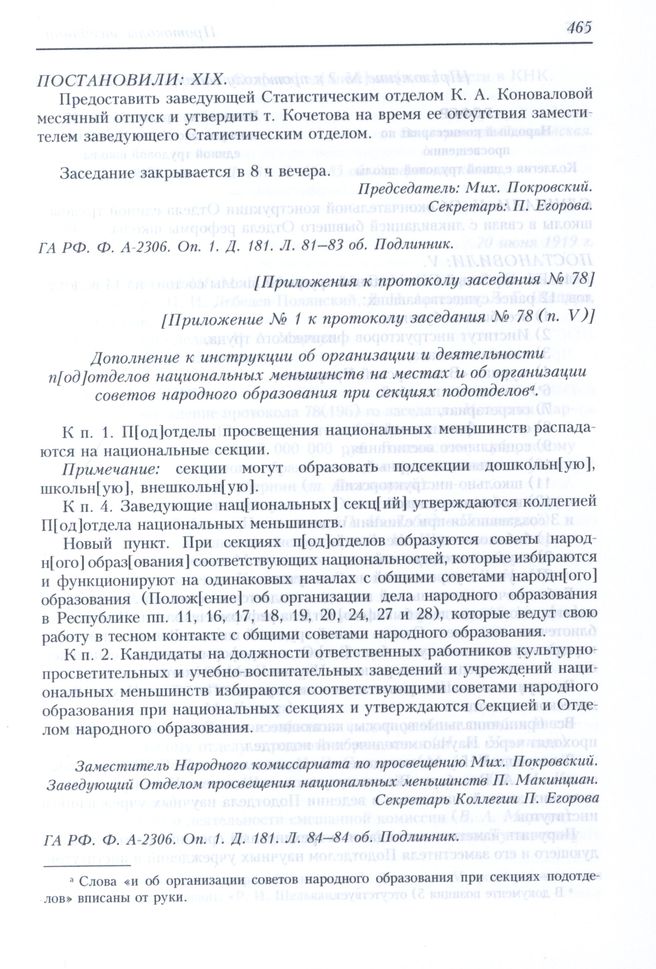 Архив новейшей истории России. Серия «Публикации». Т. XII. Культура, наука и образование. Октябрь 1917—1920 гг. Протоколы и постановления Наркомпроса РСФСР. В 3 кн. Кн. 2. Январь — декабрь 1919 г. — М.: Фонд «Связь Эпох», Кучково поле, 2016.