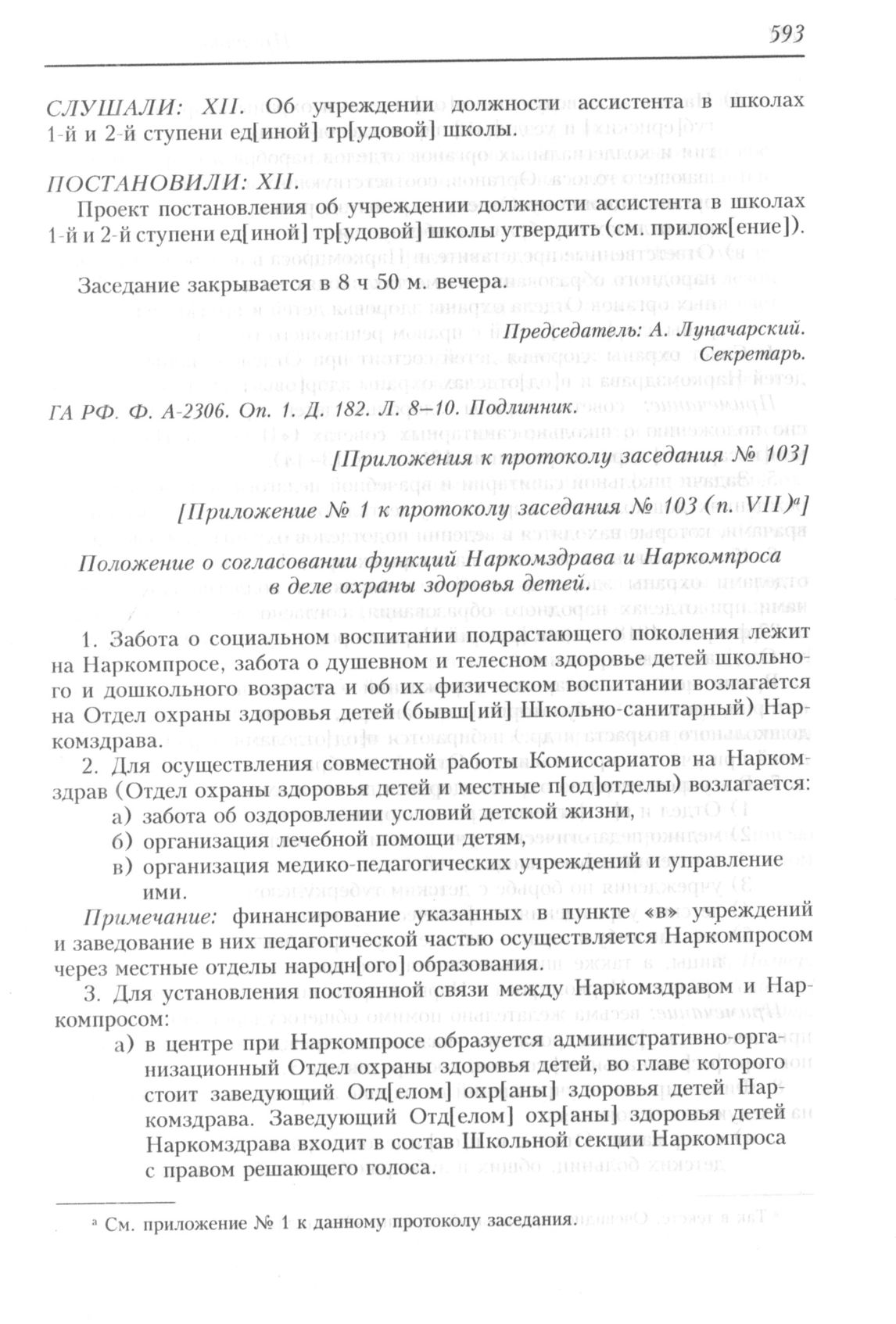 Приложение № 1 к протоколу заседания № 103 (п. VII) Коллегии Народного комиссариата по просвещению РСФСР. Положение о согласовании функций Наркомздрава РСФСР и Наркомпроса РСФСР в деле охраны здоровья детей