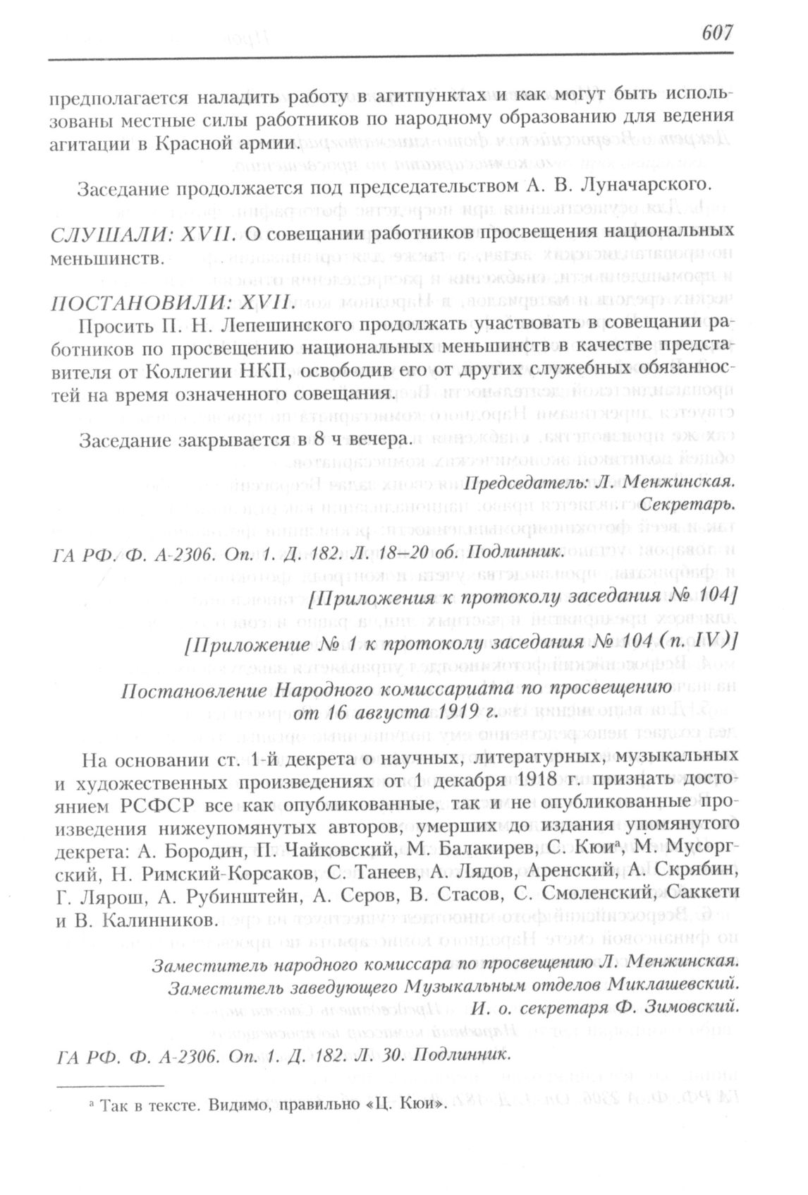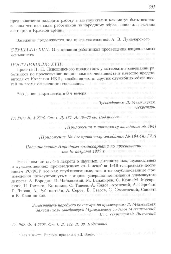 Приложение № 1 к протоколу заседания № 104 (п. IV) Коллегии Народного комиссариата по просвещению РСФСР. Постановление Народного комиссариата по просвещению РСФСР от 16 августа 1919 г. // ГА РФ. Ф. А-2306. Оп. 1. Д. 182. Л. 30. Подлинник.