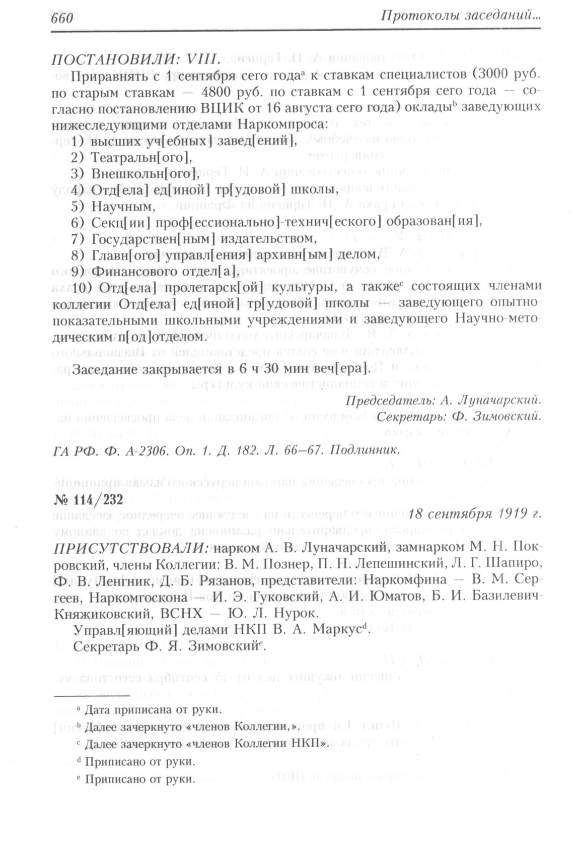 Протокол заседания Коллегии Народного комиссариата по просвещению РСФСР № 114/232. 18 сентября 1919 г.