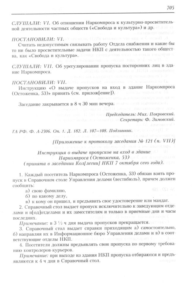 Приложение к протоколу заседания № 121 (п. VII) Коллегии Народного комиссариата по просвещению РСФСР. Инструкция о выдаче пропусков на вход в здание Наркомпроса РСФСР (Остоженка, 53) принята в заседании Коллегии НКП РСФСР 7 октября 1919 года