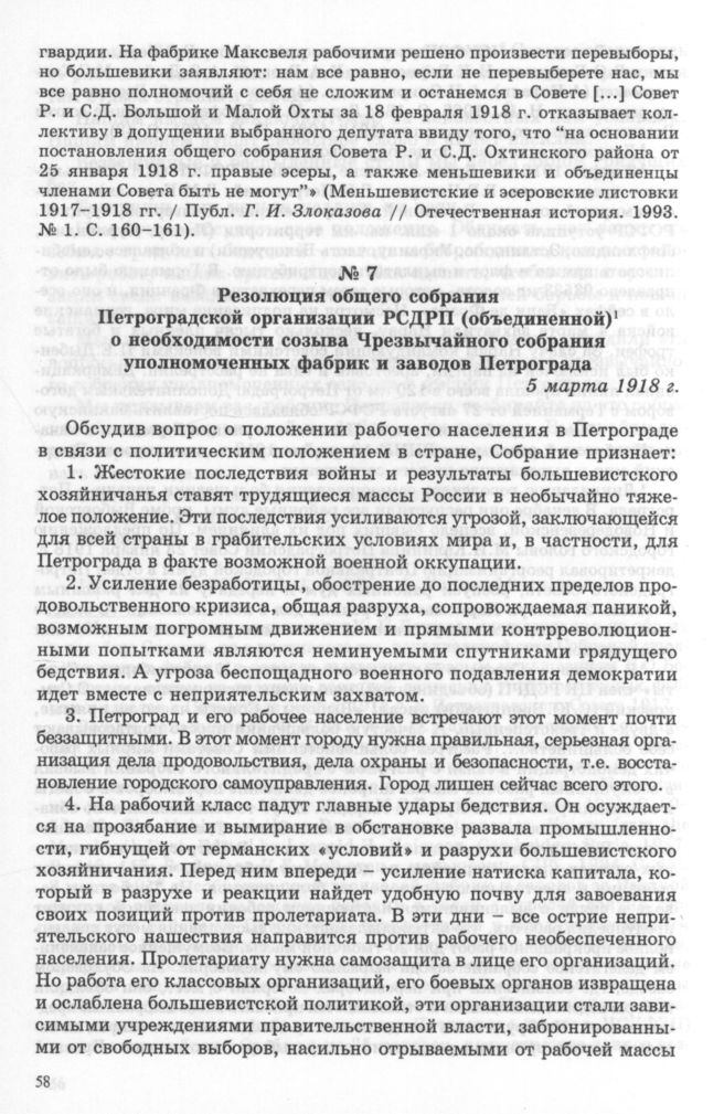 Резолюция общего собрания Петроградской организации РСДРП (объединенной) о необходимости созыва Чрезвычайного собрания уполномоченных фабрик и заводов Петрограда. 5 марта 1918 г. // ЦГА СПб. Ф. 3390, oп. 1, д. 18, л. 30. Копия. Машинопись.