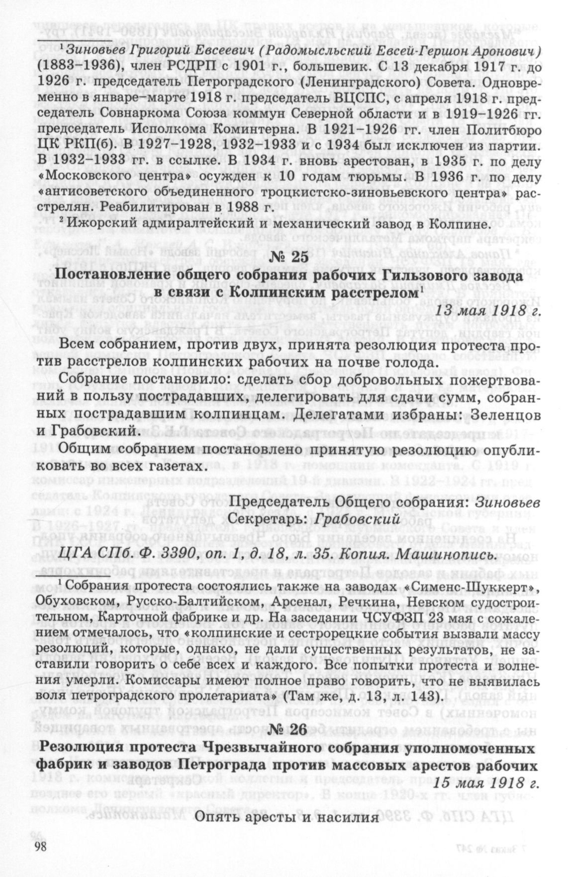 Резолюция протеста Чрезвычайного собрания уполномоченных фабрик и заводов Петрограда против массовых арестов рабочих. 15 мая 1918 г. // ЦГА СПб. Ф. 3390, oп. 1, д. 17, л. 15. Копия, машинопись.