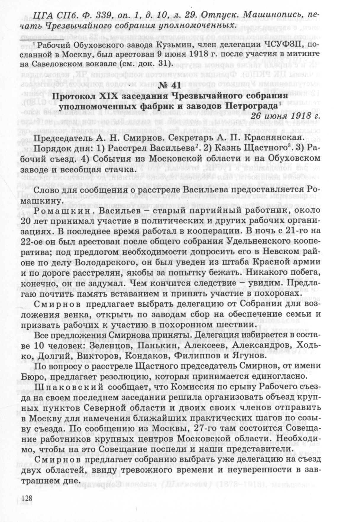 Протокол XIX заседания Чрезвычайного собрания уполномоченных фабрик и заводов Петрограда. 26 июня 1918 г. // ЦГА СПб. Ф. 3390, oп. 1, д. 13, л. 218-226. Заверенная копия. Машинопись, печать ЧСУФЗП.