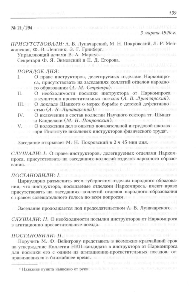 Протокол заседания Коллегии Народного комиссариата по просвещению РСФСР № 21/294. 3 марта 1920 г.