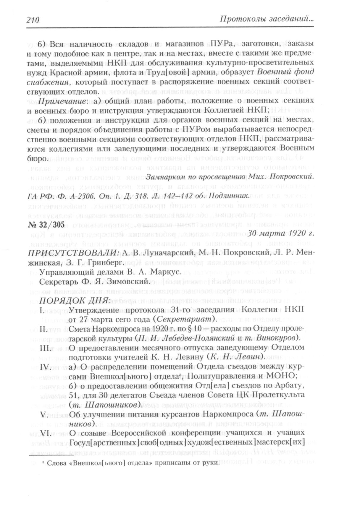 Протокол заседания Коллегии Народного комиссариата по просвещению РСФСР № 32/305. 30 марта 1920 г. // ГА РФ. Ф. А-2306. Оп. 1. Д. 318. Л. 143-144 об. Подлинник.