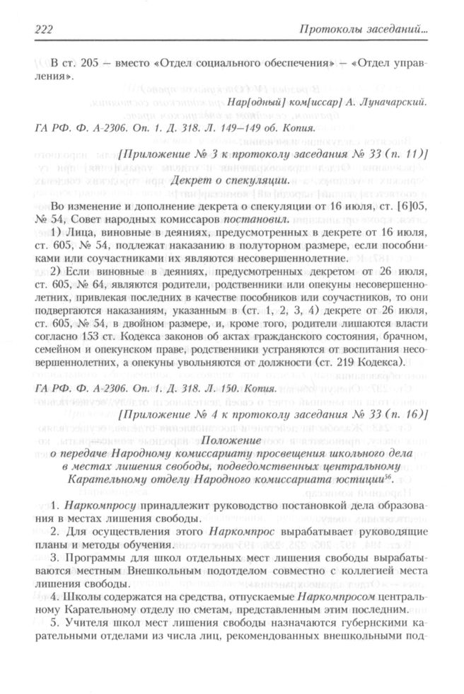 Приложение № 3 к протоколу заседания № 33 (п. 11) Коллегии Народного комиссариата по просвещению РСФСР. Декрет о спекуляции // ГА РФ. Ф. А-2306. Оп. 1. Д. 318. Л. 150. Копия.