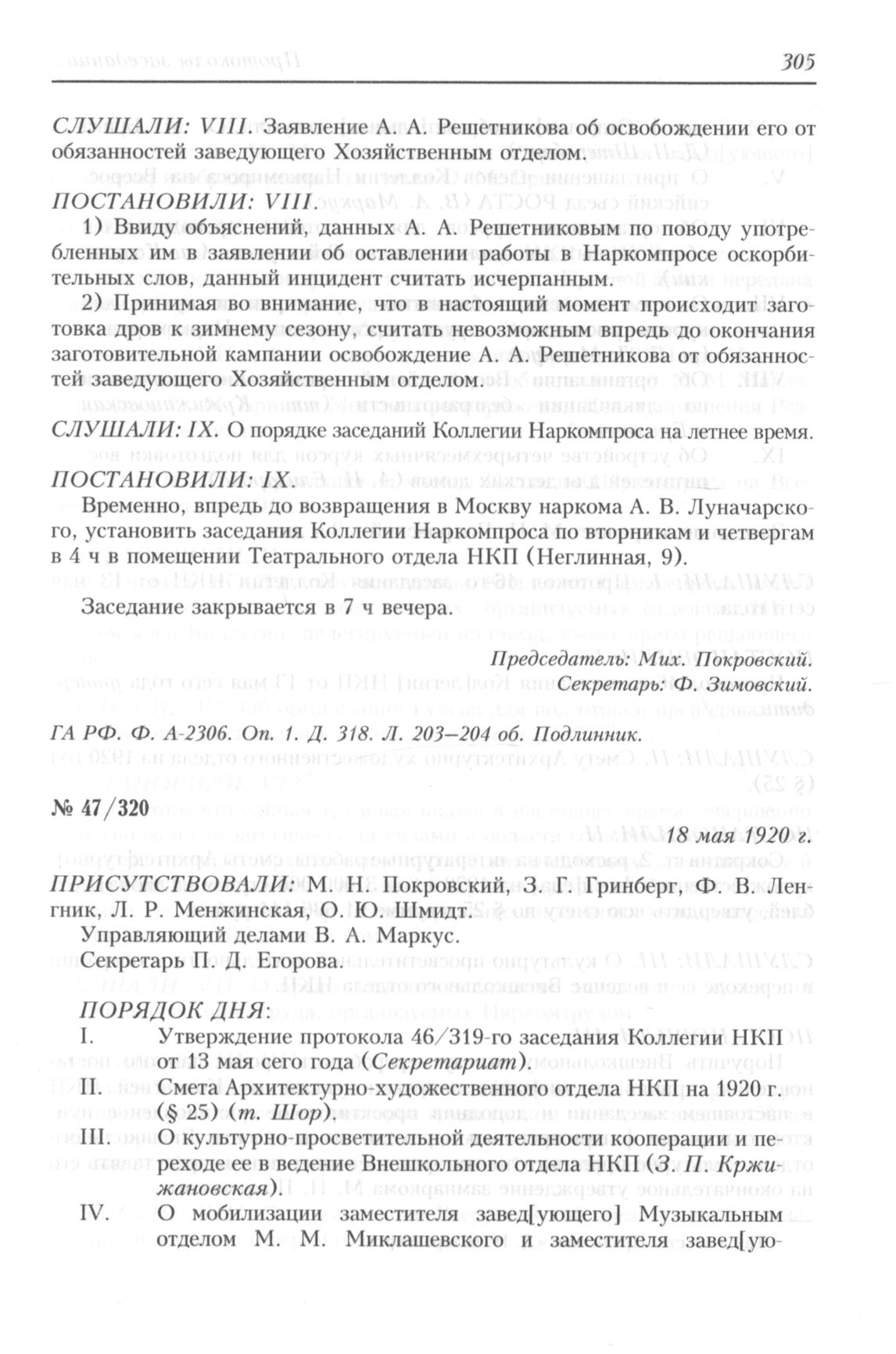 Протокол заседания Коллегии Народного комиссариата по просвещению РСФСР № 47/320. 18 мая 1920 г. // ГА РФ. Ф. А-2306. Оп. 1. Д. 318. Л. 205-206. Подлинник.