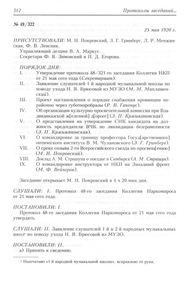 Протокол заседания Коллегии Народного комиссариата по просвещению РСФСР № 49/322. 25 мая 1920 г.