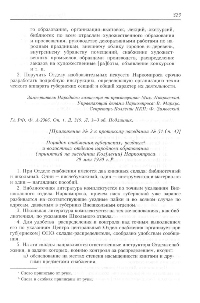 Приложение № 2 к протоколу заседания № 51 (п. 4) Коллегии Народного комиссариата по просвещению РСФСР. Порядок снабжения губернских, уездныха и волостных отделов народного образования принятый на заседании Коллегии Наркомпроса РСФСР 29 мая 1920 г.// ГА РФ. Ф. А-2306. Оп. 1. Д. 319. Л. 4-4 об. Подлинник.