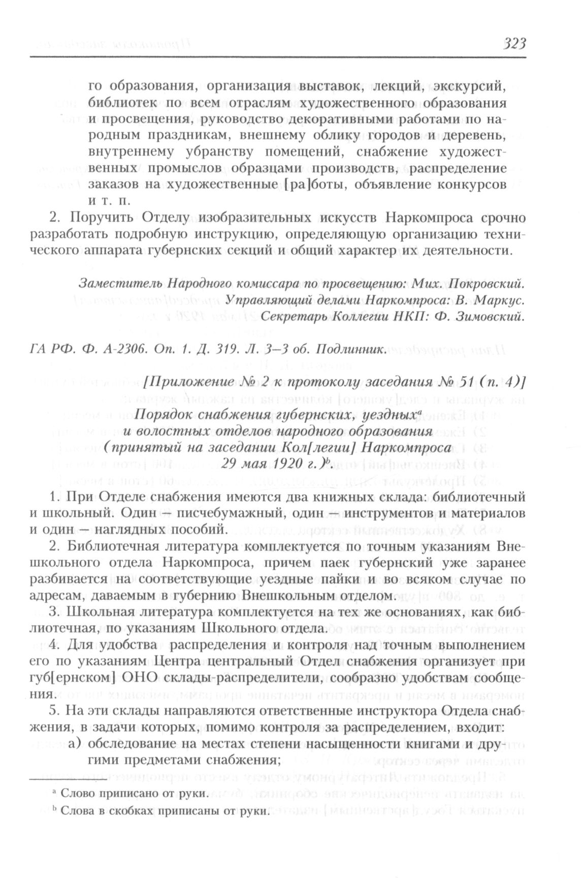 Приложение № 2 к протоколу заседания № 51 (п. 4) Коллегии Народного комиссариата по просвещению РСФСР. Порядок снабжения губернских, уездныха и волостных отделов народного образования принятый на заседании Коллегии Наркомпроса РСФСР 29 мая 1920 г.