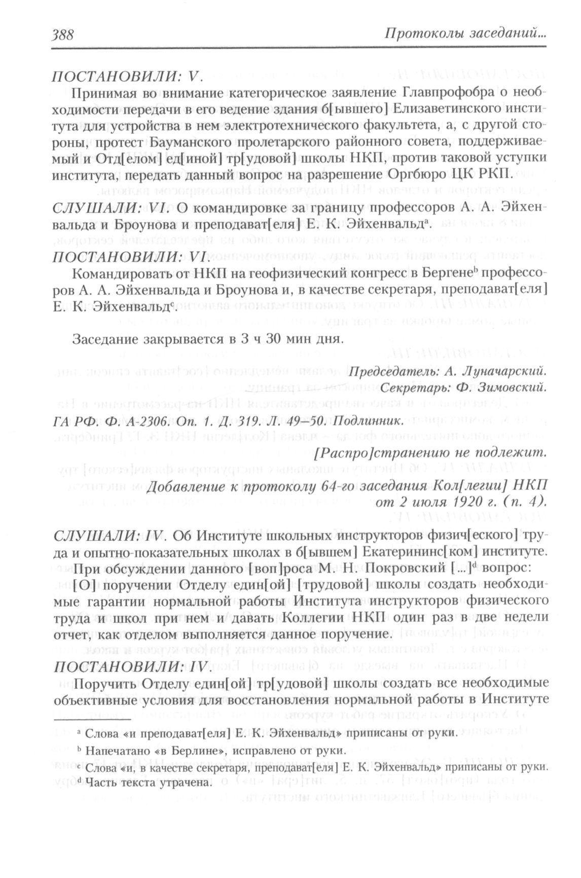 Добавление к протоколу 64-го (п. 4) заседания Коллегии Народного комиссариата по просвещению РСФСР. 2 июля 1920 г. // ГА РФ. Ф. А-2306. Оп. 1. Д. 319. Л. 51. Копия.
