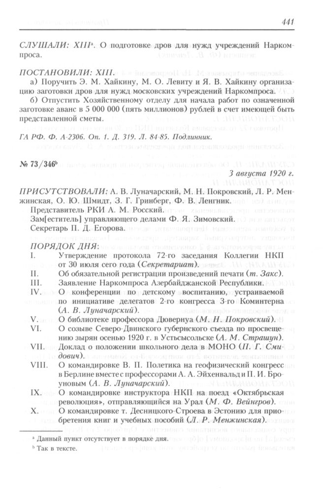 Протокол заседания Коллегии Народного комиссариата по просвещению РСФСР № 73/346. 3 августа 1920 г.