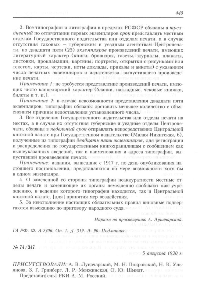 Протокол заседания Коллегии Народного комиссариата по просвещению РСФСР № 74/347. 5 августа 1920 г.