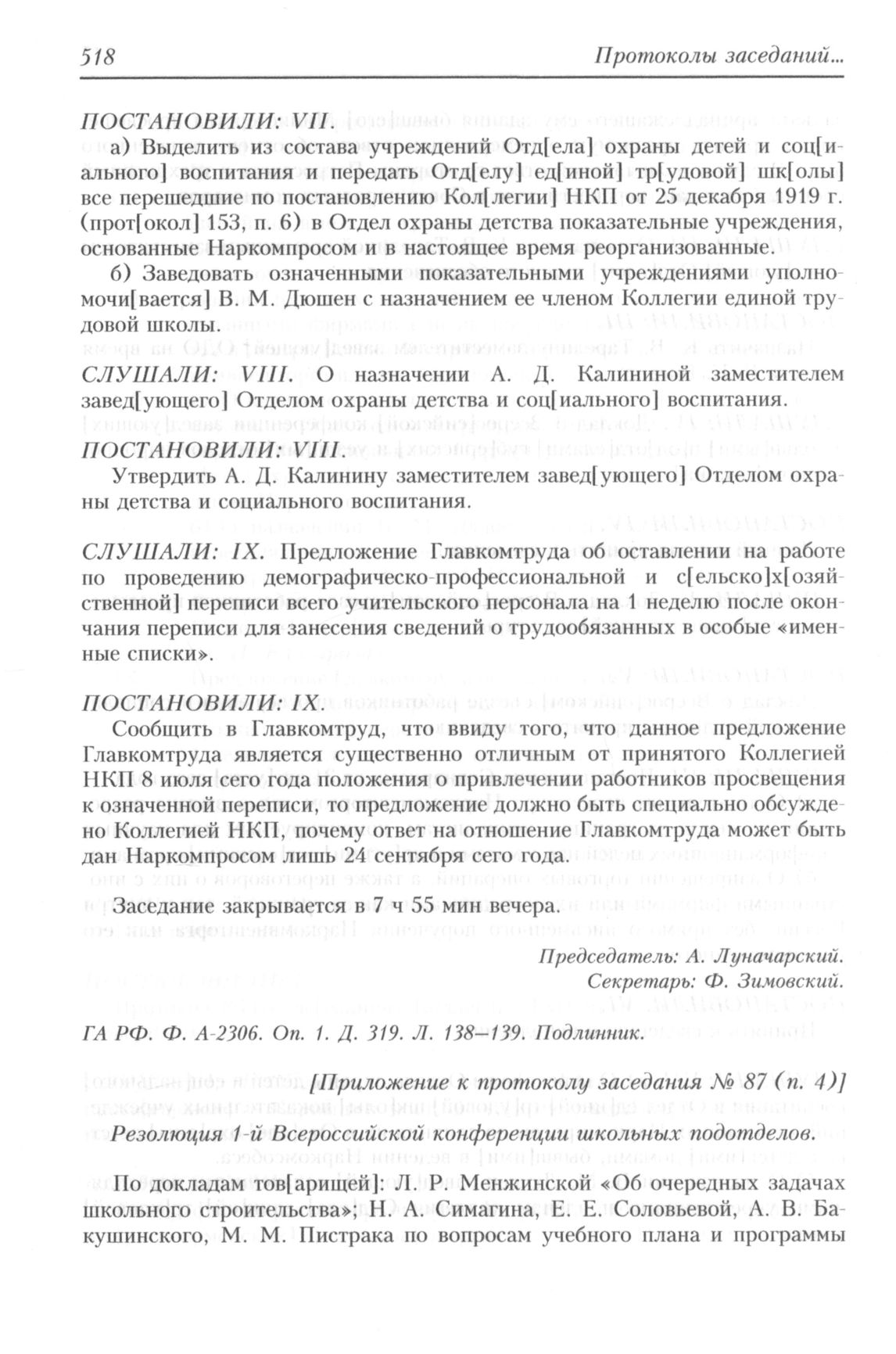 Приложение к протоколу заседания № 87 (п. 4) Коллегии Народного комиссариата по просвещению РСФСР. Резолюция 1-й Всероссийской конференции школьных подотделов. 22 августа 1920 г. // ГА РФ. Ф. А-2306. Оп. 1. Д. 319. Л. 140-141. Копия.