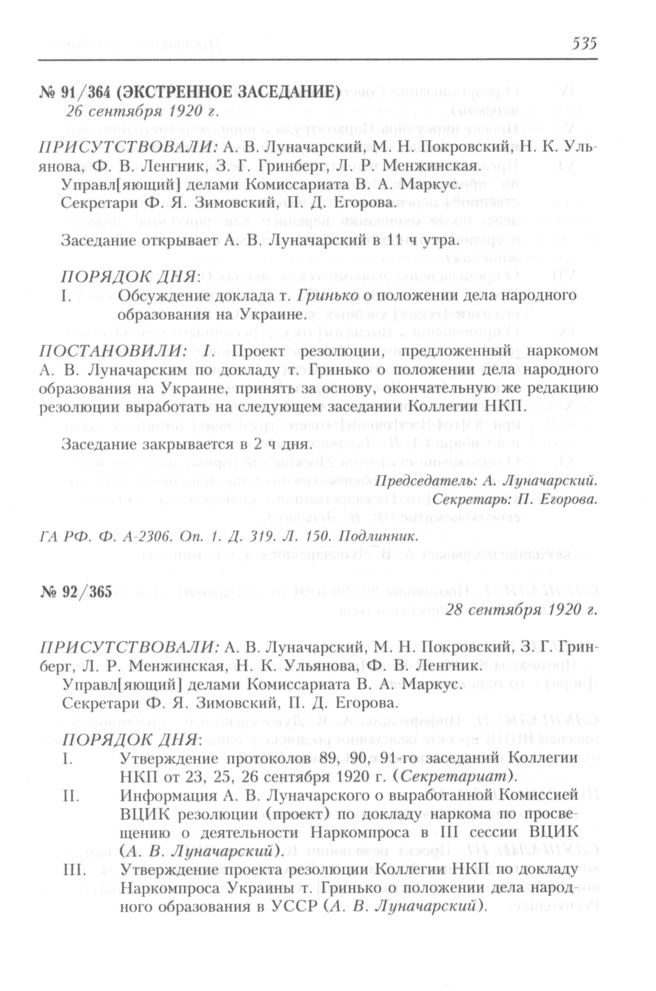 Протокол заседания Коллегии Народного комиссариата по просвещению РСФСР № 92/365. 28 сентября 1920 г. // ГА РФ. Ф. А-2306. Оп. 1. Д. 319. Л. 151-152. Подлинник.