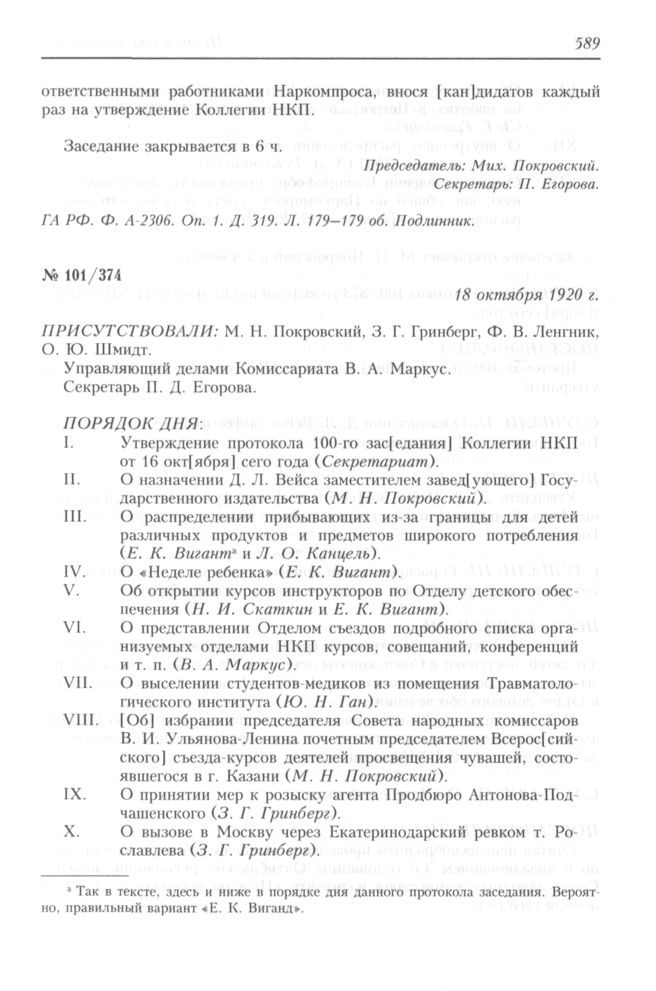 Протокол заседания Коллегии Народного комиссариата по просвещению РСФСР № 101/374. 18 октября 1920 г. // ГА РФ. Ф. А-2306. Оп. 1. Д. 324. Л. 1-2. Подлинник.