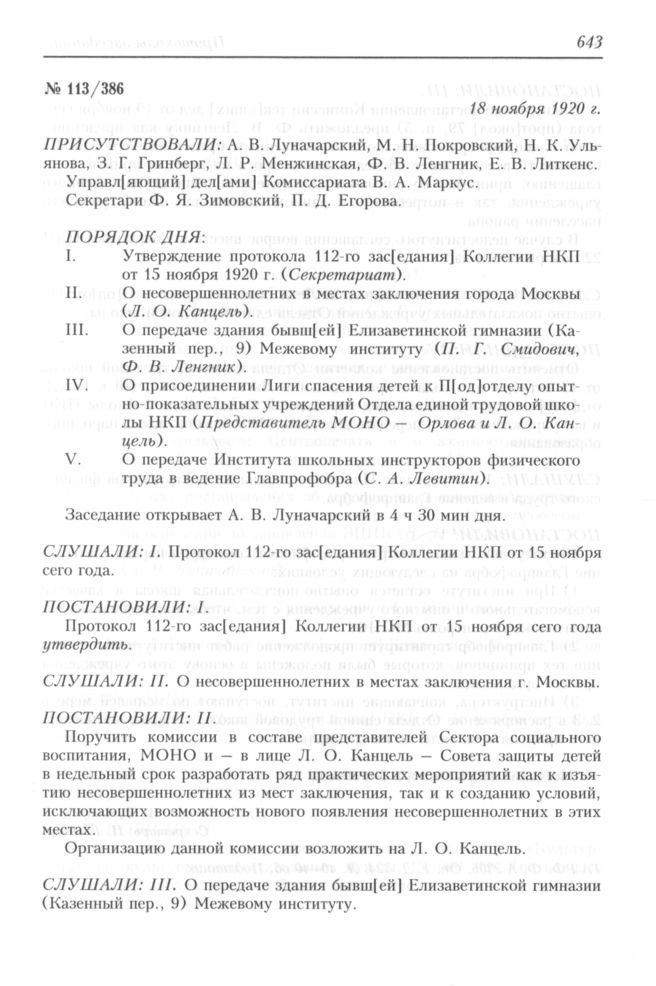 Протокол заседания Коллегии Народного комиссариата по просвещению РСФСР № 113/386. 18 ноября 1920 г.