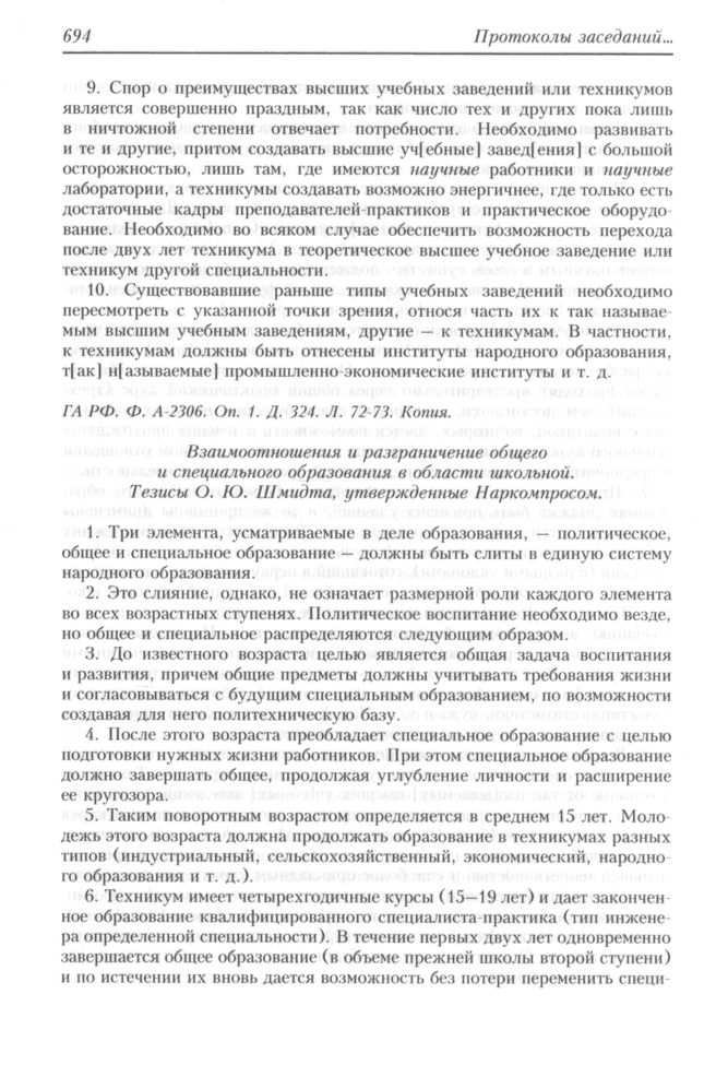 Взаимоотношения и разграничение общего и специального образования в области школьной. Тезисы О. Ю. Шмидта, утвержденные Наркомпросом РСФСР // ГА РФ. Ф. А-2306. Оп. 1. Д. 324. Л. 74. Копия.