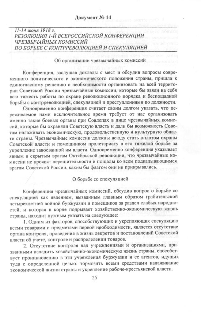 Резолюция 1-й Всероссийской конференции чрезвычайных комиссий по борьбе с контрреволюцией и спекуляцией. 11-14 июня 1918 г.