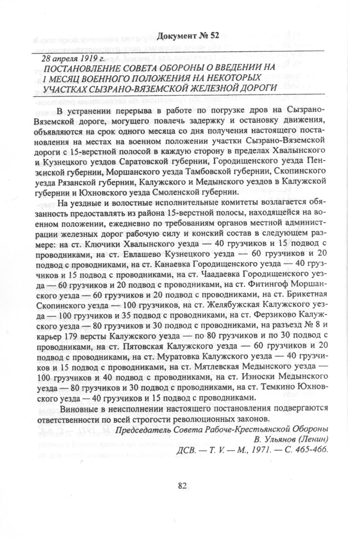 Постановление Совета обороны РСФСР о введении на 1 месяц военного положения на некоторых участках Сызрано-Вяземской железной дороги. 28 апреля 1919 г. // ДСВ. — T. V.— М., 1971. — С. 465 - 466.