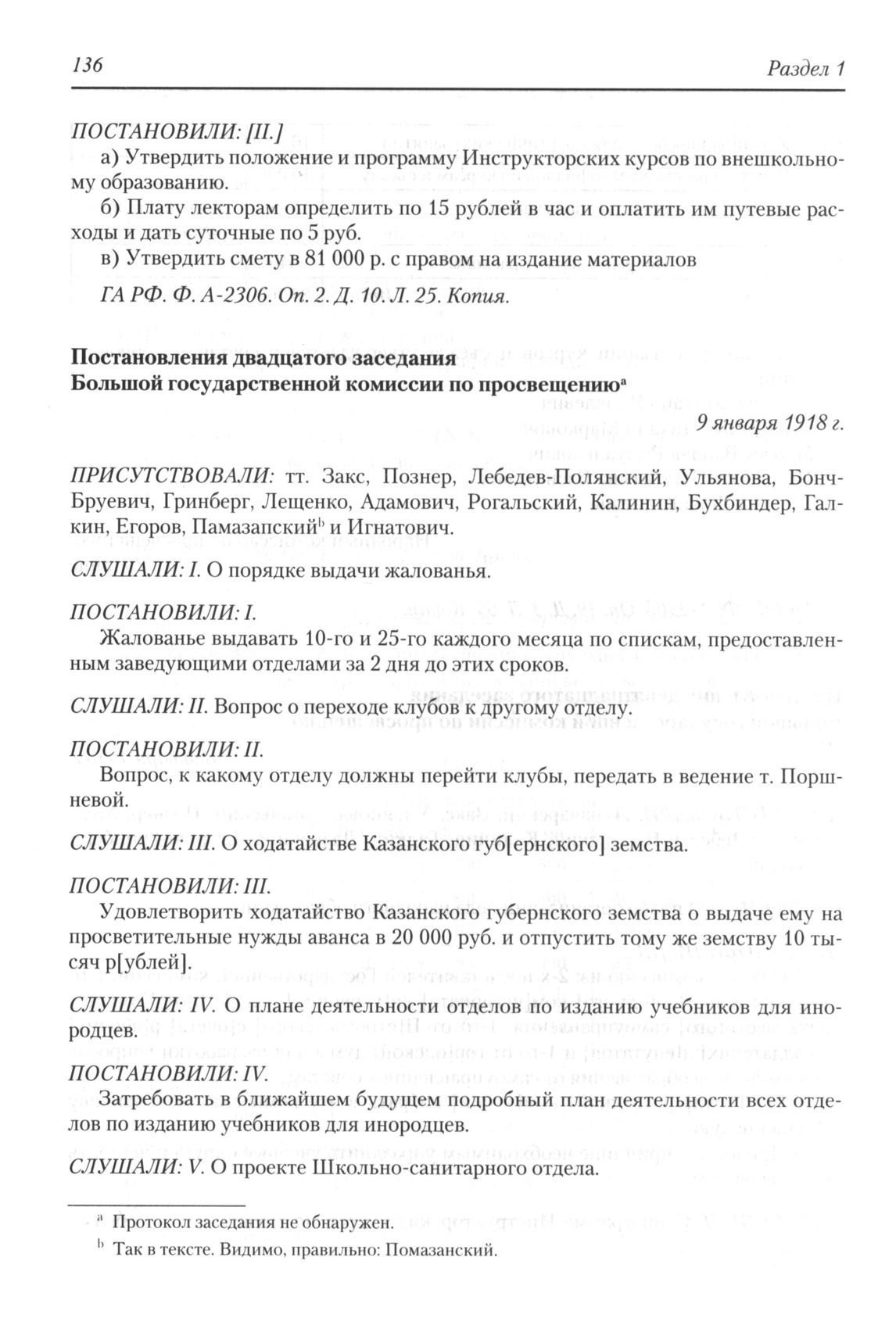 Постановления двадцатого заседания Большой государственной комиссии по просвещению Народного комиссариата по просвещению РСФСР 9 января 1918 г. // ГА РФ. Ф. А-2306. Оп. 2. Д. 10. Л. 26-26 об. Копия.