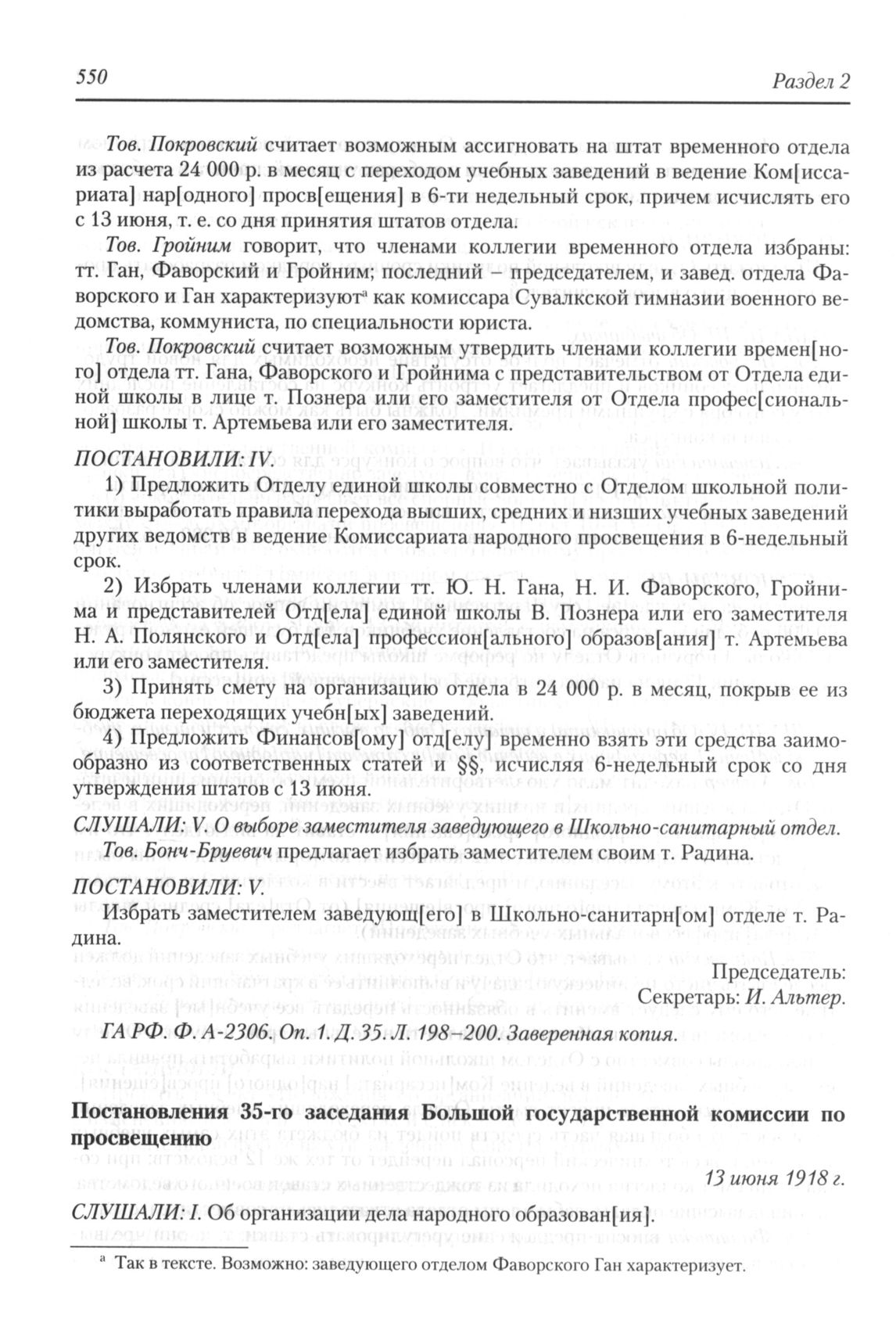 Постановления 35-го заседания Большой государственной комиссии по просвещению Народного комиссариата по просвещению РСФСР 13 июня 1918 г. // ГА РФ. Ф. А-2306. Оп. 1. Д. 35. Л. 204. Копия.