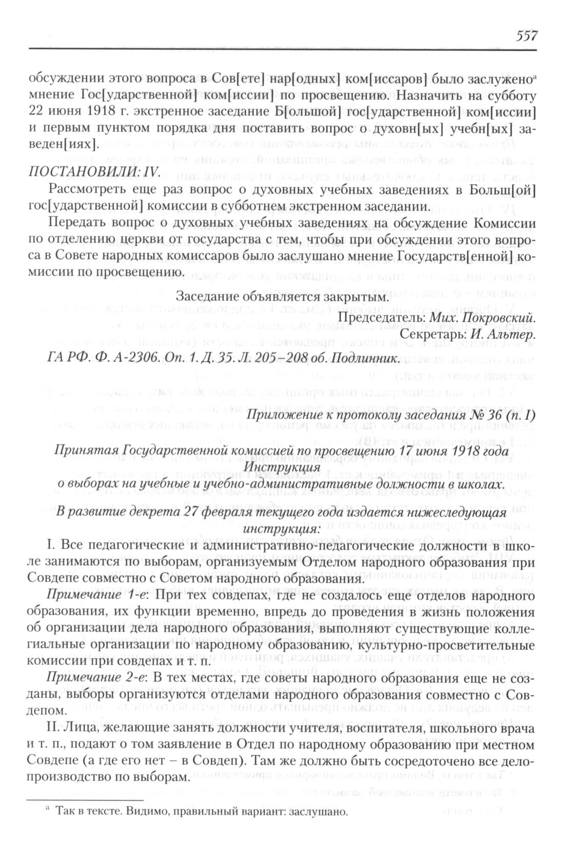 Приложение к протоколу заседания Государственной комиссии по просвещению Народного комиссариата по просвещению РСФСР № 36 (п. I). Принятая Государственной комиссией по просвещению Народного комиссариата по просвещению РСФСР 17 июня 1918 года Инструкция о выборах на учебные и учебно-административные должности в школах // ГА РФ. Ф. А-2306. Оп. 2. Д. 8. Л. 168-169. Копия.