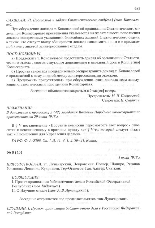 Протокол заседания Коллегии Народного комиссариата по просвещению РСФСР № 8 (45). 5 июля 1918 г. // ГА РФ. Ф. А-2306. Оп. 1. Д. 41. Ч. 1. Л. 32-32 об. Копия.