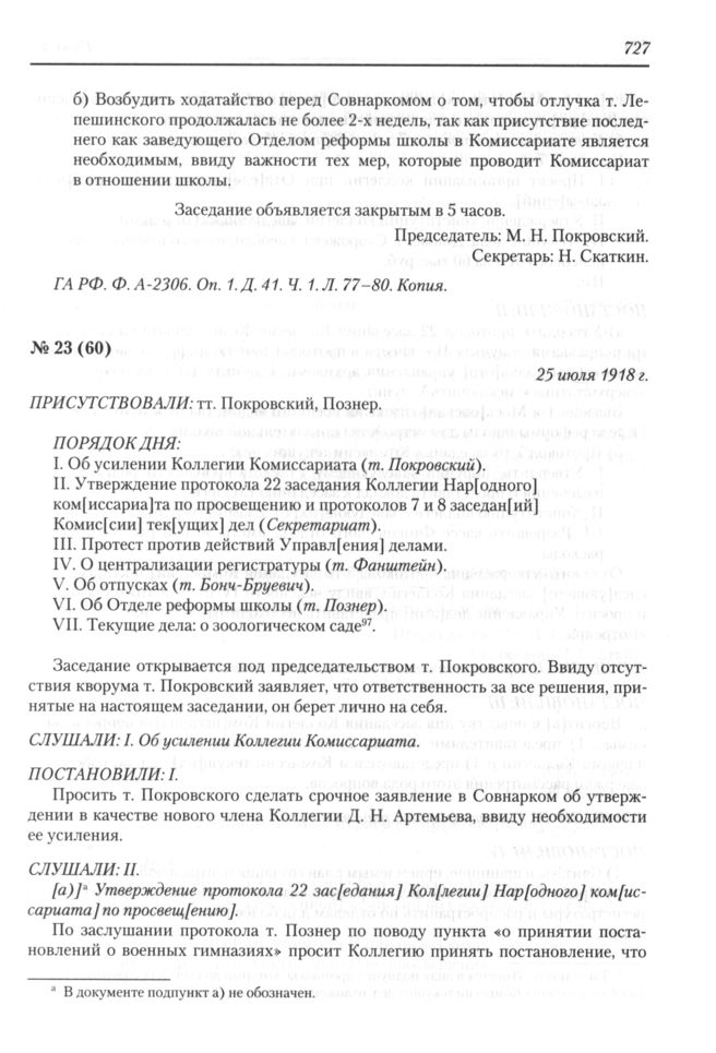 Протокол заседания Коллегии Народного комиссариата по просвещению РСФСР № 23 (60). 25 июля 1918 г.