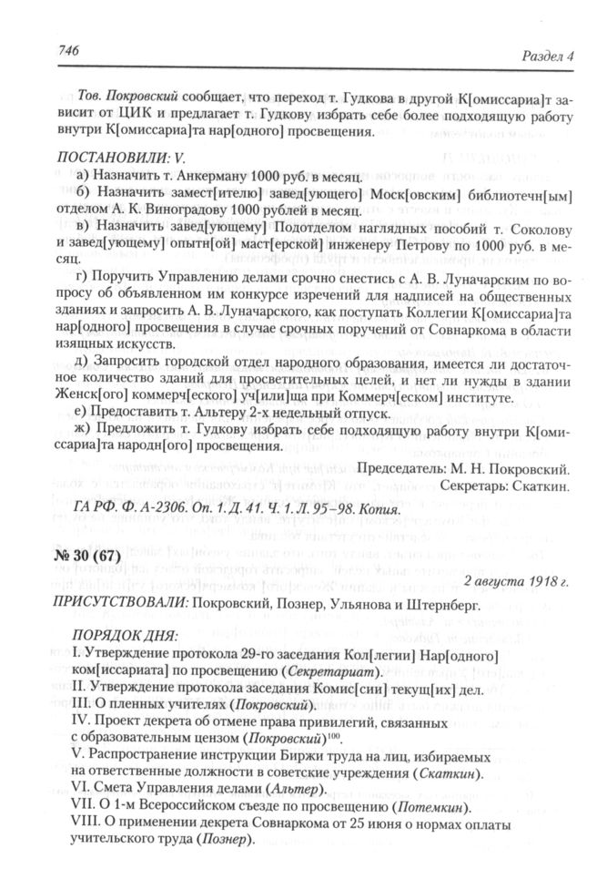 Протокол заседания Коллегии Народного комиссариата по просвещению РСФСР № 30 (67). 2 августа 1918 г. // ГА РФ. Ф. А-2306. Оп. 1. Д. 41. Ч. 1. Л. 99-101. Копия.