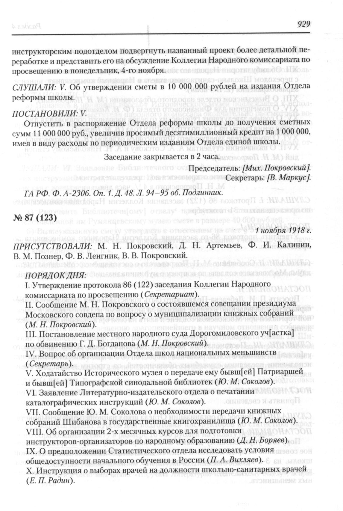 Протокол заседания Коллегии Народного комиссариата по просвещению РСФСР № 87 (123). 1 ноября 1918 г. // ГА РФ. Ф. А-2306. Оп. 1. Д. 48. Л. 97-100 об. Подлинник.