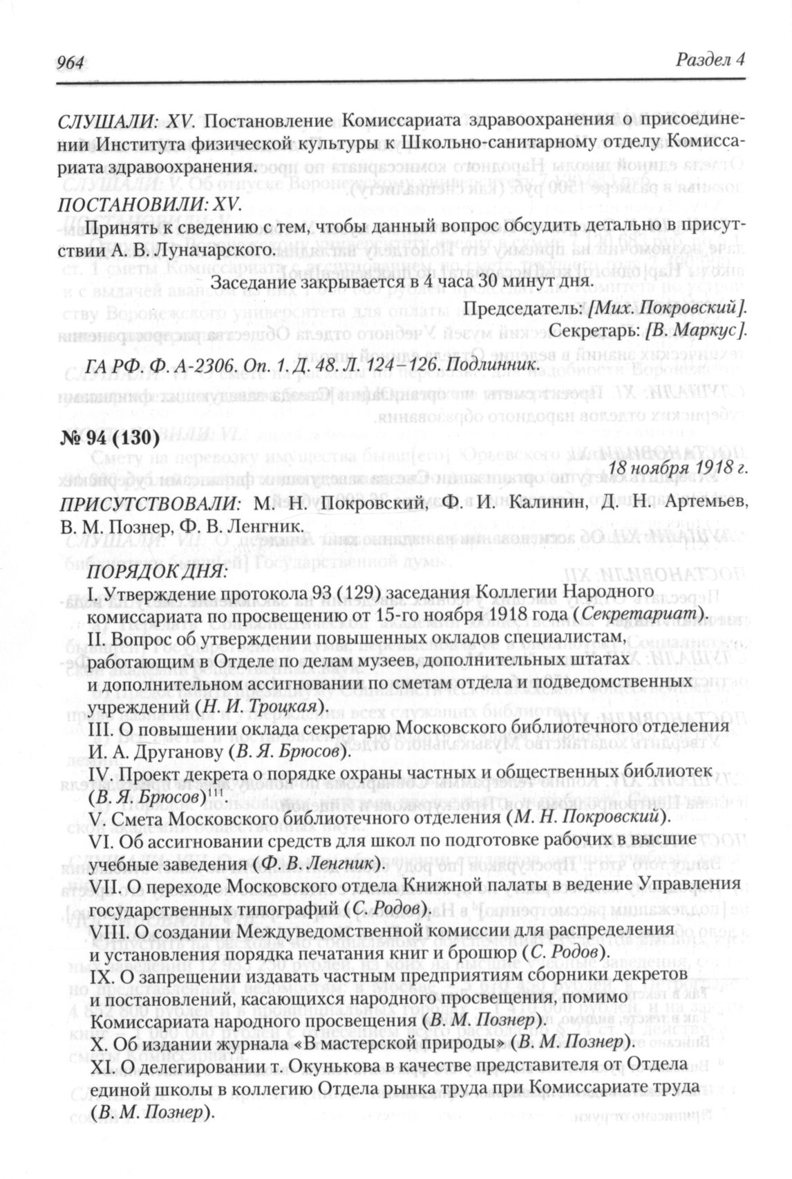 Протокол заседания Коллегии Народного комиссариата по просвещению РСФСР № 94 (130). 18 ноября 1918 г. // ГА РФ. Ф. А-2306. Оп. 1. Д. 48. Л. 127-130 об. Подлинник.