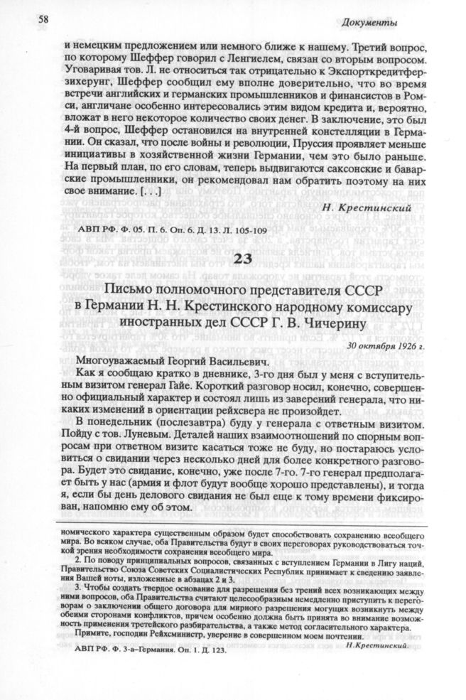 Письмо полномочного представителя СССР в Германии Н. Н. Крестинского народному комиссару иностранных дел СССР Г. В. Чичерину. 30 октября 1926 г. // АВП РФ. Ф. 04. Оп. 13. п. 90. Д. 50186. Л. 18.