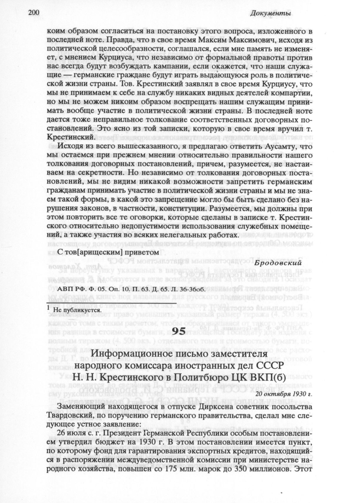 Информационное письмо заместителя народного комиссара иностранных дел СССР Н. Н. Крестинского в Политбюро ЦК ВКП(б). 20 октября 1930 г. // АВП РФ. Ф. 05. Оп. 10. П. 62. Д. 60. Л. 35-33.