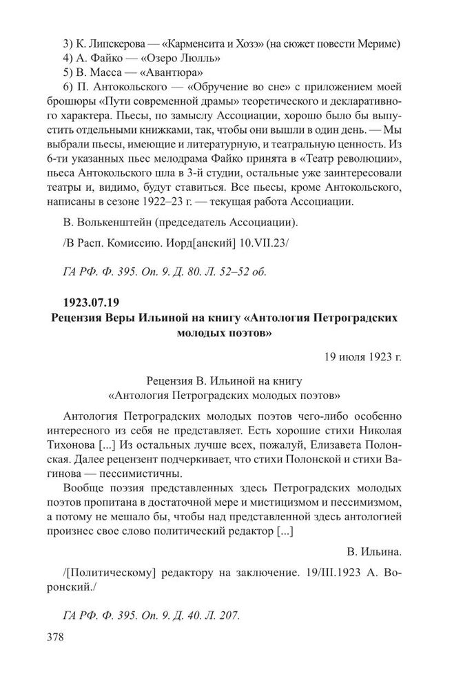 Рецензия Веры Ильиной на книгу «Антология Петроградских молодых поэтов». 19 июля 1923 г. // ГА РФ. Ф. 395. Оп. 9. Д. 40. Л. 207.