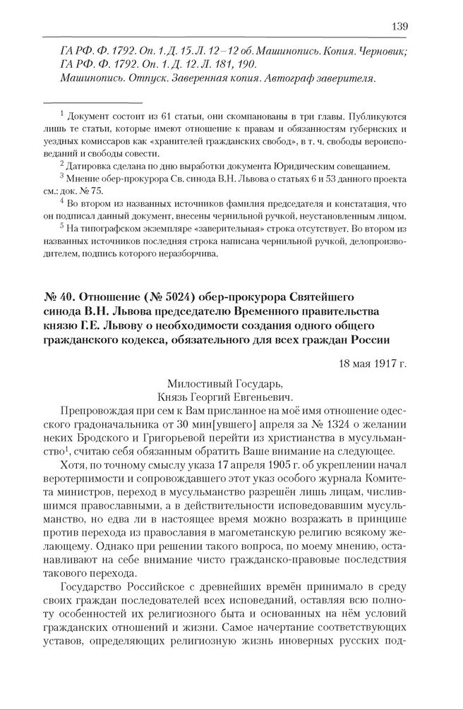 Отношение (№ 5024) обер-прокурора Святейшего синода В.Н. Львова председателю Временного правительства князю Г.Е. Львову о необходимости создания одного общего гражданского кодекса, обязательного для всех граждан России. 18 мая 1917 г.