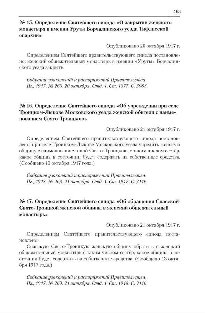 Определение Святейшего синода «Об обращении Спасской Свято-Троицкой женской общины в женский общежительный монастырь». Опубликовано 21 октября 1917 г. // Собрание узаконений и распоряжений Правительства. Пг., 1917. № 263. 21 октября. Отд. 1. Ст. 1918. С. 3116.