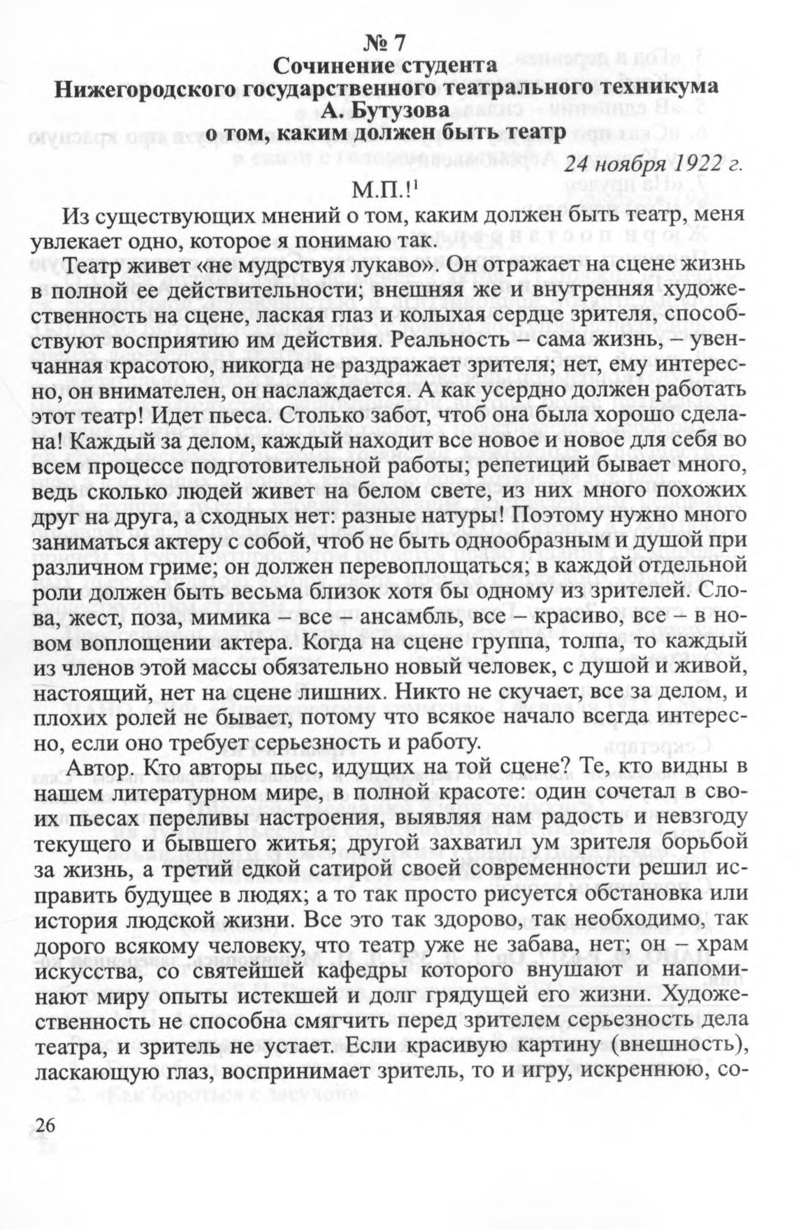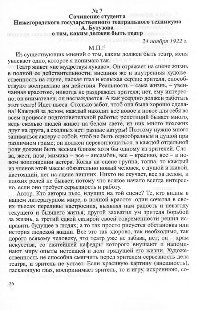 Сочинение студента Нижегородского государственного театрального техникума А. Бутузова о том, каким должен быть театр. 24 ноября 1922 г.